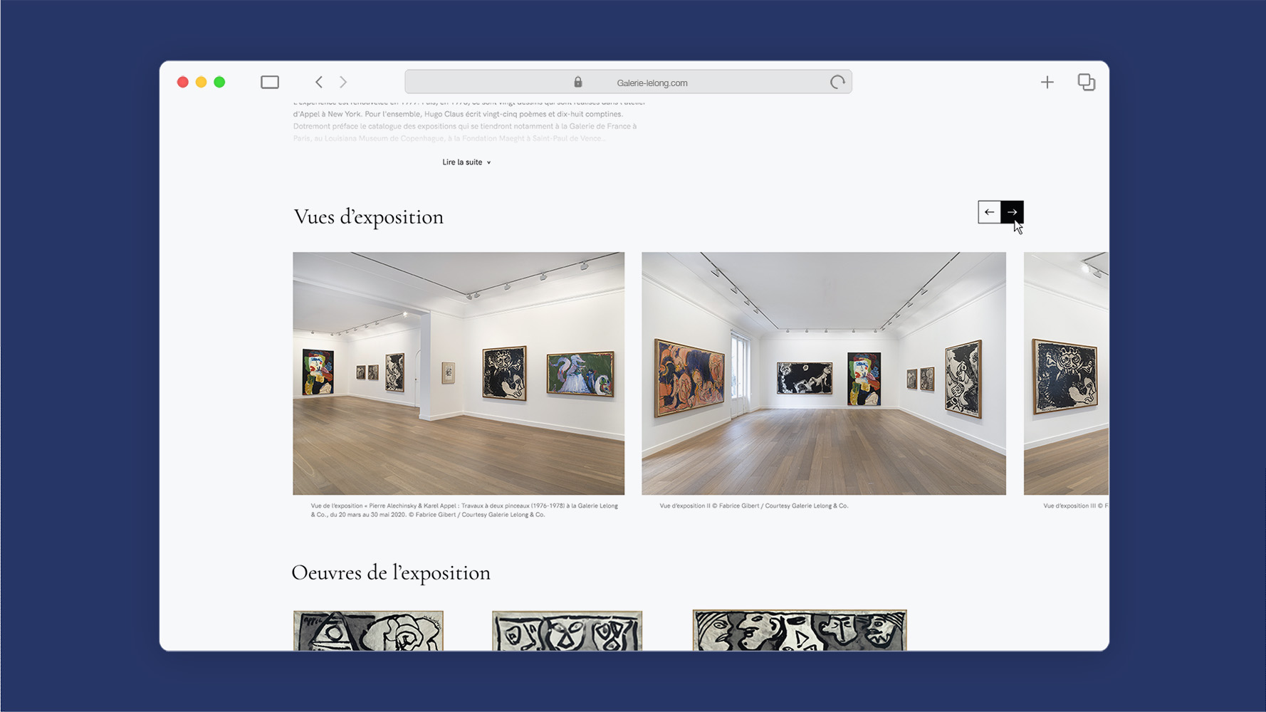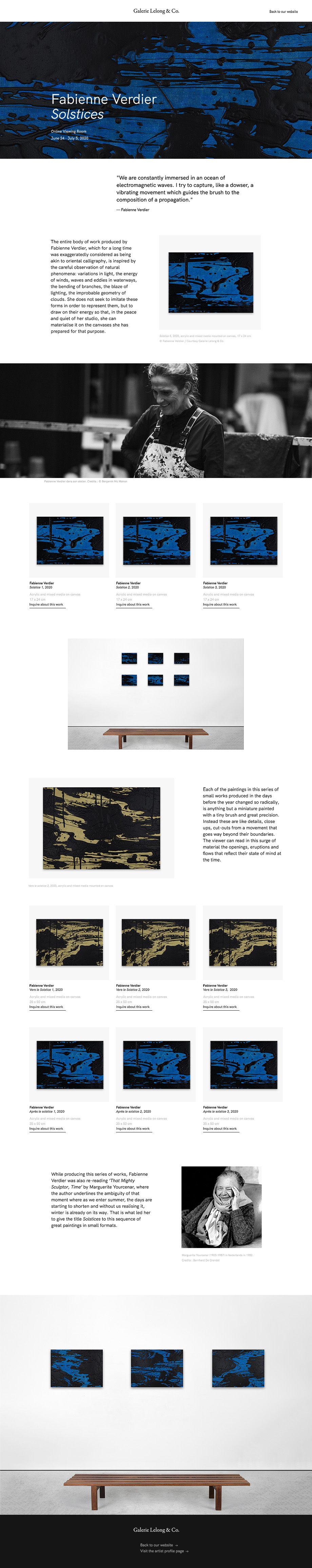 Missions • Maquettage et intégration web de viewing rooms (expositions en ligne), sous forme de one-page, optimisation des réseaux sociaux (35k followers Instagram, soit +700% sur 3 ans), optimisation du webdesign existant, maquette de newsletters, gestion de la stratégie marketing sur les sites de ventes spécialisés, administration IT